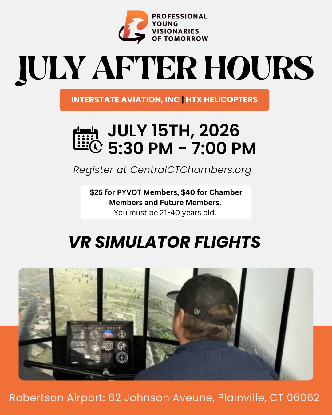 PYVOT invites young professionals ages 21 to 40 to an exclusive after-hours aviation experience at Interstate Aviation Inc., commonly known as Robertson Airport, in partnership with HTX Helicopters.Founded in 1911, Robertson Airport is Connecticut’s oldest operating airfield and one of the earliest centers of flight in New England. The airport hosted its first documented flight on May 18, 1911 and has remained a vital part of Connecticut’s aviation history for more than a century. In 1941, Stamford Robertson purchased and expanded the property, transforming it into the modern aviation facility it is today.Attendees will experience two state-of-the-art simulators rarely available in a single event. The Redbird MCX Airplane Flight Simulator delivers a realistic fixed-wing flight experience, while the Redbird VTO Helicopter Simulator, operated by HTX Helicopters, offers a high-intensity vertical flight simulation. Each simulator provides a distinct and immersive aviation experience.This limited-capacity event combines cutting-edge technology with historic surroundings, creating a high-demand evening designed for those seeking a standout PYVOT experience.Pricing:$25 for PYVOT members$40 for nonmembersAttendance is limited. Registration is required.