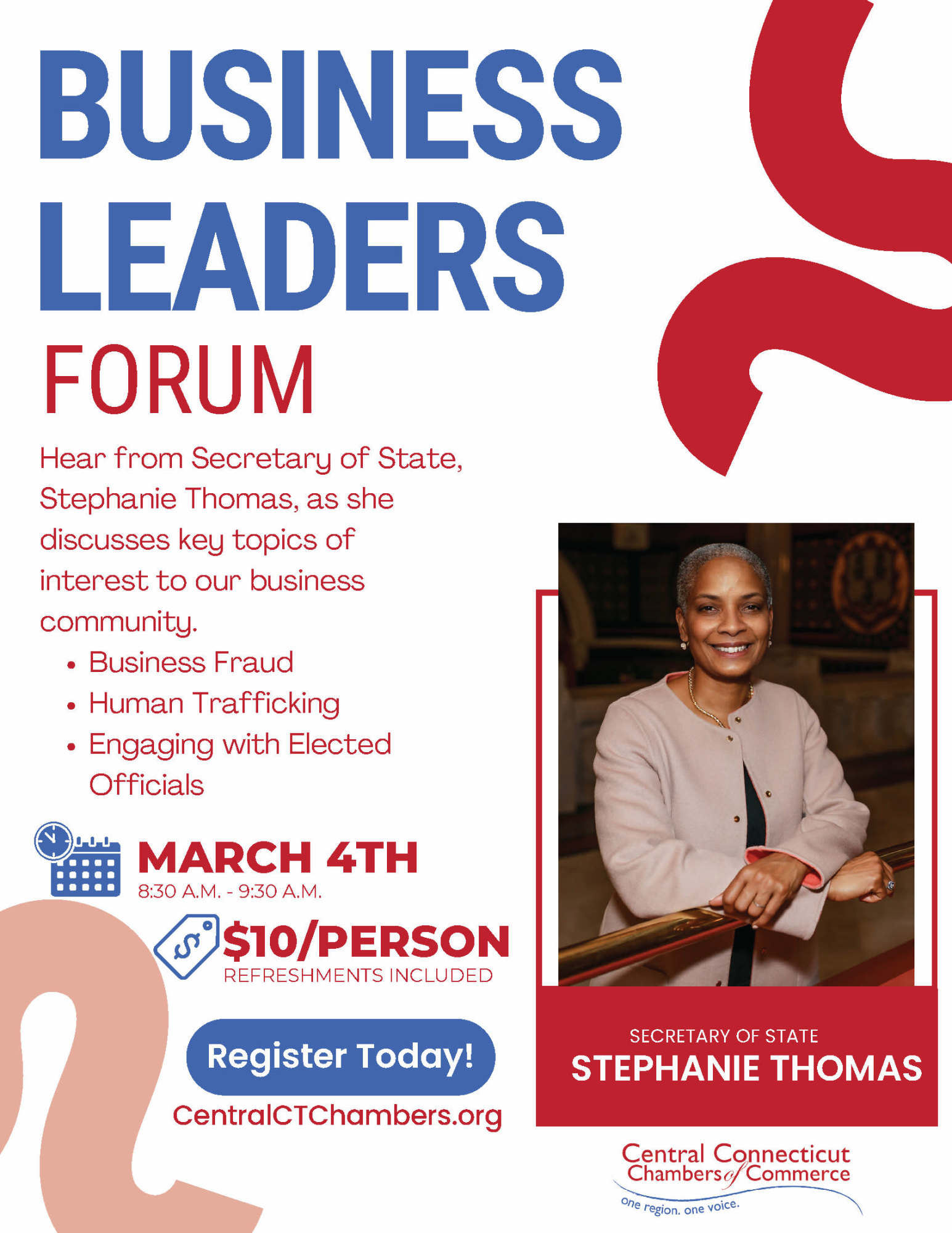 Hear from Secretary Thomas on topics such as business fraud, human trafficking, and engaging with elected officials.