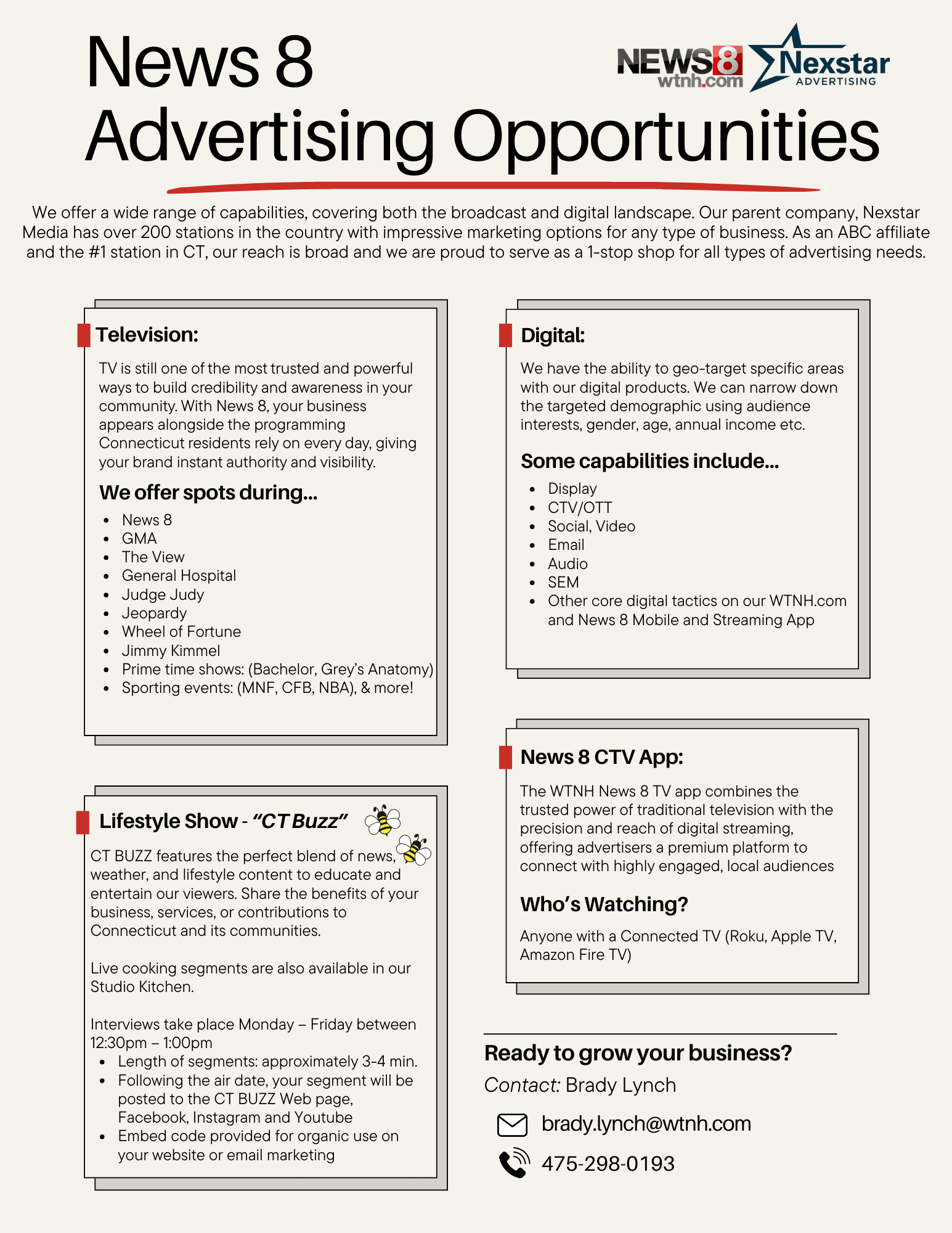 I am a Media Sales professional at WTNH News 8 in New Haven. With a background in strategic media planning, I help all types of businesses achieve their goals through customized advertising solutions. If you are interested in growing your business through the use of linear and digital advertising campaigns, please reach out!