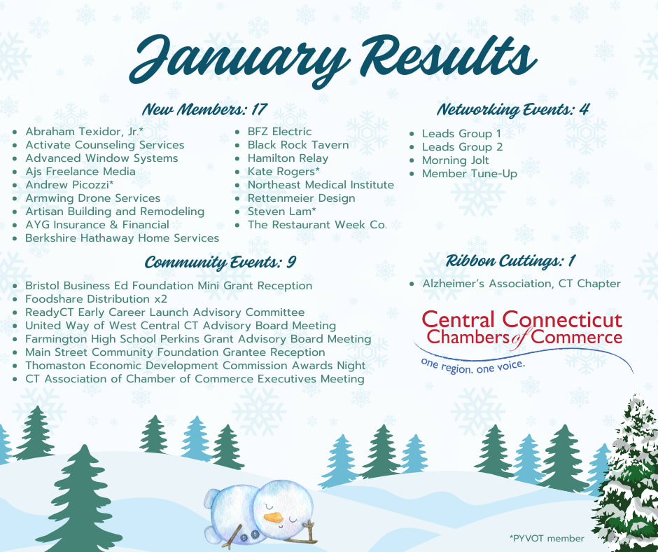 The Central Connecticut Chambers of Commerce is ready to help new and old businesses of all sizes. As a member of our community, you have access to information and services that are innovative and tailored to the needs of your business. By participating in regional planning activities, the Central Connecticut Chambers of Commerce represents the goals and aspirations of our member communities. By using our connections within the community and in the state capital, we are able to continue to push the growth and development of Central Connecticut in the right direction.